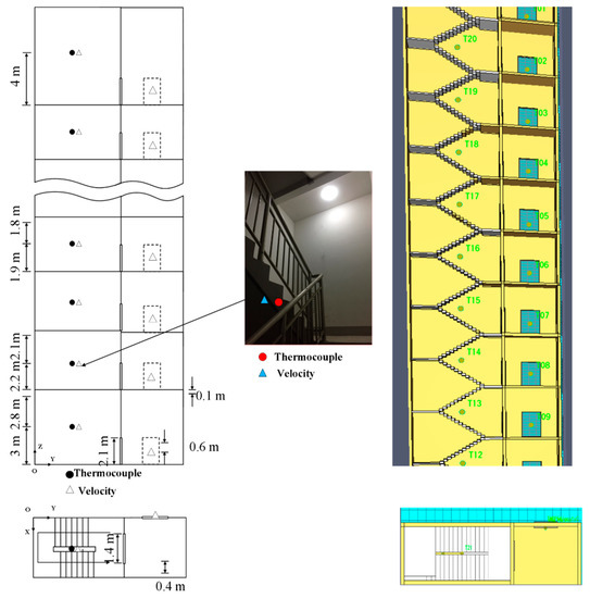 Layout of measuring point ---- Several sensor planes were positioned in the model to obtain the temperature distribution and smoke flow for a qualitative analysis. However, an accurate quantitative study should be based on detector results; thus, more probes, such as thermocouples and velocity sensors, were employed in the model as follows. For the recording of the temperature, 21 thermocouples were positioned in the gaps between two stairs in the model, as showed in Figure 3. For the recording of the velocity; similarly, the sensors were placed in the gap in the middle of the stairwell in the simulation model. These measurement points were placed in the same line in the model and their coordinates can be expressed as (3, 1.5, z). All these placement in the model are clearly presented in Figure 3.