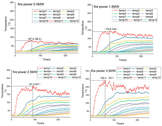 Buoyancy-driven thermal smoke has a significant influence on the temperature distribution in a stairwell [18]. Based on Figure 3, the influence of the fire HRR on the temperature distribution in the stairwell could not be clearly determined. Hence, the temperatures recorded using the thermocouples placed on each floor during the simulations were employed for further evaluation. Figure 5 presents the changes in temperature with respect to different fire HRRs (0.5 MW, 1.5 MW, 2.5 MW, and 3.5 MW), wherein curves of different colors represent different heights. It was concluded that an increase in the power of the fire source resulted in an increase in the temperature of the stairwell. At a fire HRR of 0.5 MW, the maximum temperature of Floor 1 was 80.3 °C, whereas at a fire HRR of 3.5 MW, the maximum temperature of Floor 1 was 241 °C, which is nearly greater than the value at a fire HRR of 0.5 MW by a factor of 3. Furthermore, the temperature curves of the lower floors were few and widely spaced; whereas for higher floors, the temperature curves were closely spaced. In particular, the temperature difference in the near-fire area was more pronounced, and the temperature difference in the area far away from the fire was smaller.