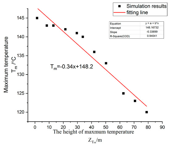 The scattered data in Figure 10 were obtained from the third and fourth columns of Table 5, which illustrate the relationship between the maximum temperature and fire source location. A linear relationship was found between the maximum temperature and the fire source location [16], which could be fitted using the least squares method, and it is indicated by the red line in Figure 10. Moreover, it can be expressed mathematically by Equation (8):