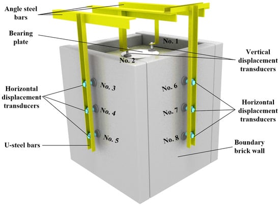 Six horizontal displacement transducers are placed on the surrounding brick walls. In detail, three are installed on the south wall, and another three are on the east wall. These six transducers are divided into three groups to measure the horizontal displacement of model fillings 10 cm, 30 cm, and 50 cm below model surface. The horizontal displacement transducers have the same working mechanism as the vertical ones. The sensor coils keep still upon the U-steel bars, which are depended on angle steel bars and finally attached to the steel brackets on the ground. When horizontal displacement occurs, the induction apparatus on the brick wall will move outward, leading to the variation of eddy current. At last, the transducers will give the exact value about the horizontal displacement. The layout of displacement transducers is shown in Figure 2. All the transducers are marked from No. 1 to No. 8 to distinguish from each other.