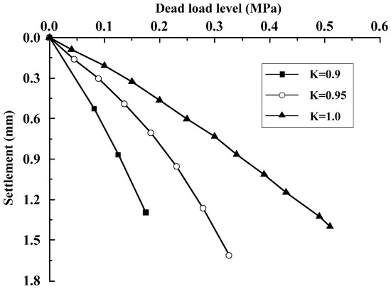 As soon as construction is finished, ground coefficient K30 for each model is precisely measured by load settlement test. It should be noted that ground coefficient K30 refers to the ratio of dead load corresponding to fiducial settlement to fiducial settlement. Generally, fiducial settlement is set as 1.25 mm. K30 is widely adopted in high-speed railway construction in Japan and China. The relationship between settlement and load level is measured for these three models, as shown in Figure 4. According to the test data, ground coefficient K30 can be calculated as 136 MPa/m, 224 MPa/m, and 373 MPa/m for the models with compaction degree of 0.9, 0.95, and 1.0 respectively. It is remarkable that the model with higher compaction degree is inclined to have a larger value of K30.