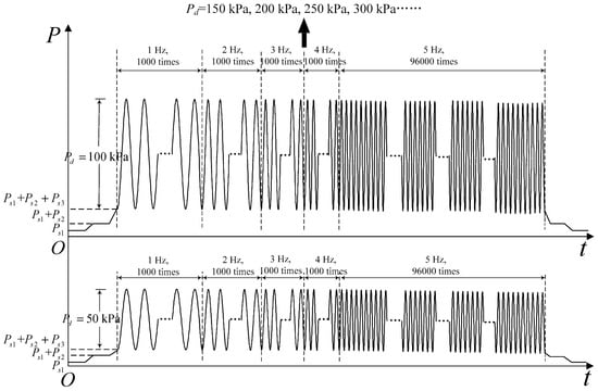 The actual load frequency suffered by subgrade bed is not a constant value. It is difficult to simulate continuous change of various load frequencies in a model test. Therefore, a load frequency of 5 Hz is adopted. At the beginning of cyclic loading stage, the frequency of cyclic loads could not be too large in case that overlarge impulsive force will influence the stability of model structure. Therefore, loading frequency gradually increases from 1 Hz to 5 Hz at each cyclic loading level. Initially, cyclic load is imposed with 1 Hz loading frequency for the first 1000 loading times. Then, loading frequency increases step-by-step to 2 Hz, 3 Hz, and 4 Hz for the second, third, and fourth 1000 loading times. Finally, the cyclic load stays stable at 5 Hz for the remaining 96,000 times. In total, the cyclic loading is applied for 100,000 times at each loading level. When a certain level of cyclic loading is over, only dead loads are imposed on the bearing plate till the next level of cyclic load is coming. The cyclic loading program is shown in detail in Figure 5.