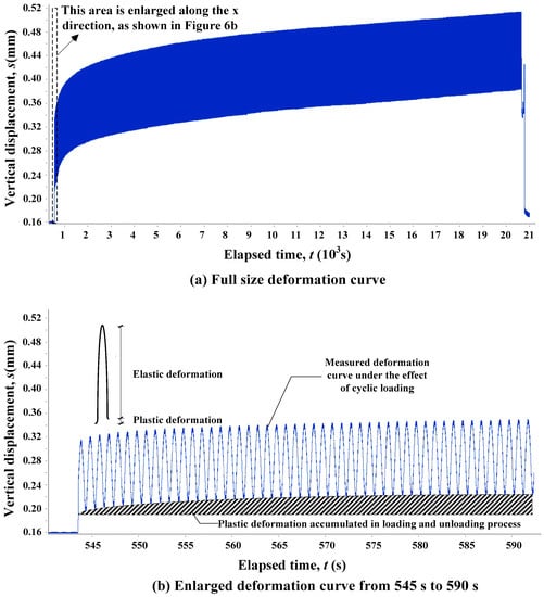 The vertical deformation is precisely measured by the vertical displacement transducers located on the model surface in real time. When Pd = 100 kPa, the displacement of Model 3 measured by the No.1 vertical transducer is shown in Figure 6. Figure 6a depicts the evolvement characteristics of measured deformation in the entire cyclic loading process. Figure 6b, which shows the deformation curve from 545 s to 590 s in the initial stage, is obtained from the deformation curve in the dotted box of Figure 6a and enlarged along the x direction. The deformation development demonstrates sine shaped curve in loading and unloading cycles. It is clearly indicated that both elastic and plastic deformations occur in the loading process, while only elastic deformation is recoverable during the unloading stage. In other words, a certain level of plastic deformation is sustained and developed during each loading and unloading cycle. Therefore, plastic displacement is continuously accumulated under the effect of cyclic loading. However, the growth rate of accumulated plastic deformation is gradually decreased with elapsed time (loading times) increasing under 100 kPa cyclic amplitude, which finally leads to the stable plastic displacement when loading times reach a relatively high level, as shown in Figure 6a.
