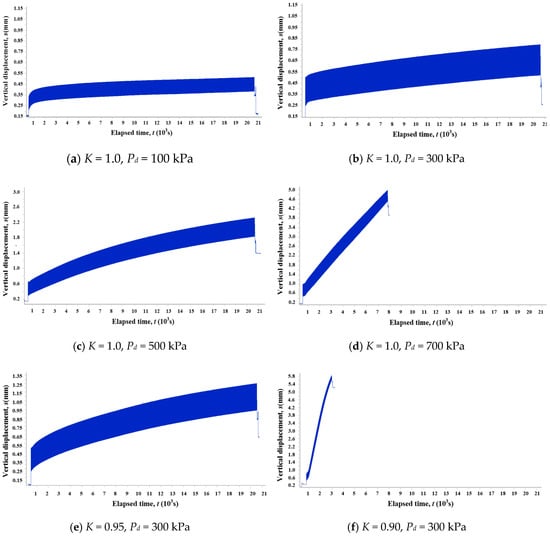 When cyclic loading level Pd ranges from 100 kPa to 700 kPa, the vertical deformation curves for Model 3 (K = 1.0) are measured by No.1 vertical transducer, as shown in Figure 7. Figure 7a–d show the curves corresponding to the condition of Pd = 100 kPa, Pd = 300 kPa, Pd = 500 kPa, and Pd = 700 kPa respectively. When Pd = 100 kPa and Pd = 300 kPa, vertical plastic deformations are finally increased quite slowly as the loading times arrive at a relatively large magnitude. Moreover, the deformations at 100,000 loading times when Pd equals to 100 kPa and 300 kPa are close to 0.50 mm and 0.85 mm, respectively. Obviously, as the amplitude of Pd increases, vertical plastic deformation is obviously improved. On the condition of Pd = 500 kPa and Pd = 700 kPa, vertical plastic deformation develops continuously with the increasing loading times. When Pd = 700 kPa, the vertical deformation rate of the filling model even increases with loading times, which undoubtedly leads to the soil structure collapse rapidly at the initial stage of cyclic loading process. Summarily, the development of plastic deformation tends to converge when amplitude of cyclic loading is relatively small for a given model with a certain compaction degree. As the cyclic loading amplitude increases, the converging deformation is also steadily improved. When the loading amplitude reaches to some extent, the tendency of the plastic displacement gradually become diverging and deformation will abidingly develop with the ever-increasing loading times. If the amplitude of cyclic load keeps growing, plastic deformation will develop at an amazing speed and model structure will break down rapidly.