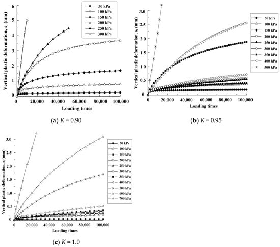 Since vertical plastic deformation can be quantitatively determined by the deformation curves, the No.1 and No.2 vertical displacement transducers could give two groups of experimental data for the plastic deformation of a given model. Therefore, plastic displacement can be precisely calculated by averaging the two groups of testing data. The development law of vertical accumulative deformation against loading times is shown in Figure 8. Figure 8a shows the evolutive law of vertical deformation for Model 1 (K = 0.9). When Pd ≤ 100 kPa, the deformation curves present almost horizontal status when the loading times increase from 80,000 to 100,000. It can be deduced that vertical deformation finally converges towards a constant value, which indicates that plastic displacement tends to be steady under a large amount of cyclic loading times. As Pd increases to 200 kPa or 250 kPa, plastic deformation seems to abidingly develop with the increasing loading times. It can be deduced that the filling model will collapse when loading times are large enough to destroy the filling structure. When Pd = 300 kPa, plastic deformation develops at an overwhelming speed and reaches to 5mm with only 10,000 loading times, and filling structure is broken with relatively fewer loading times. Figure 8b,c show the plastic deformation curves for Model 2 (K = 0.95) and Model 3 (K = 1.0) respectively. Similarly, the deformation curves for the two models firstly converge to some constant value when loading amplitude is relatively low. Then, cumulative deformation is inclined to develop continuously with increasing loading times at relatively higher loading amplitude. Finally, cumulative deformation increases sharply and lead to soil structure broken down instantaneously when amplitude is close to the bearing capacity of the filling model. Obviously, plastic deformation shows quite different developing characteristics under a wide variety of cyclic amplitudes for a given model.