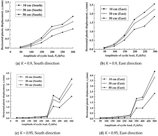Figure 10a,b show the horizontal plastic displacement of Model 1 (K = 0.9) measured by the horizontal transducers distributed on the south brick wall and the east one respectively. Testing data from the transducers on both walls indicate that the model filling with a shallower buried depth would like to have a larger magnitude of horizontal plastic displacement for a given model. Moreover, plastic displacement seems to increase sharply from the amplitude of 150 kPa to 200 kPa for the fillings buried at different depths. It can be deduced that filling structure begins to collapse in this pressure section in all probability, which leads to yielding behavior for the model filling. Moreover, horizontal displacement in the south direction is a bit smaller than that in the east direction, which can be attributed to the differences of boundary conditions provide by the sandbags and the uneven horizontal displacement of the fillings. Although horizontal displacement in the east direction is slightly larger than that in the south direction, plastic deformations in both directions have quite similar evolutive characteristics.