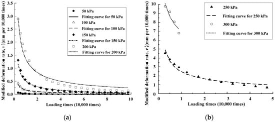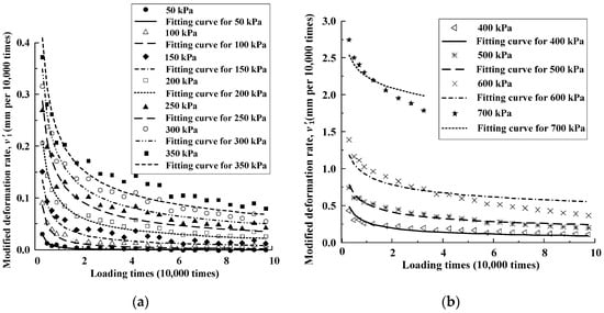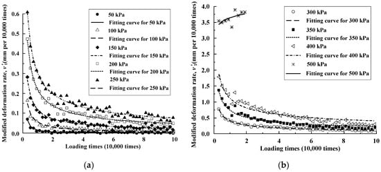 Equation (6) can be adopted to describe the modified deformation rate under different amplitudes of cyclic loading for these three models. In the process, the value of the parameters C and m can be determined by regression analysis method, as shown in Table 3. Then, fitting curves can be plotted with modified deformation rate against loading times, as shown in Figure 12, Figure 13 and Figure 14. All of the fitting curves develop well along the testing data, which indicates that the parameters C and m are reasonably set in the fitting process. Moreover, almost every regression analysis coefficient is higher than 0.90, averaging at 0.919. Obviously, for a given model, there is a group of values for C and m corresponding to a certain amplitude of cyclic loading.