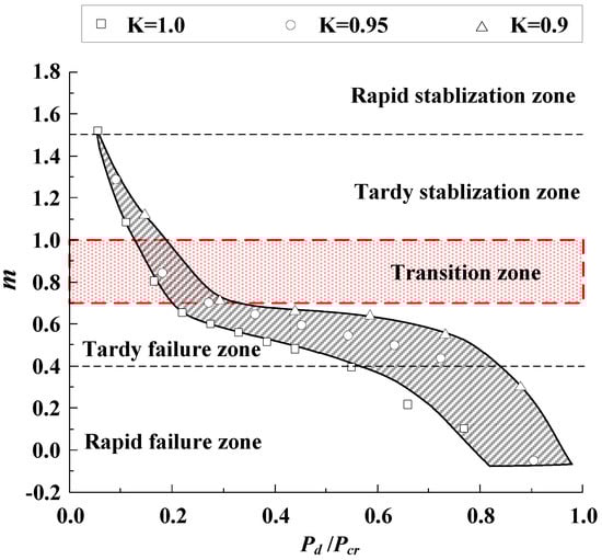With plastic deformation rate evaluated quantitatively, evolving states can be subdivided according to the developing rate of relevant status. In detail, both stabilization and failure status can be subdivided into the rapid and tardy one. It has been mentioned that the first inflection point when m = 0.7, together with the data point corresponding to m = 1, is the boundary from stabilization to failure. Then, the second inflection point when m = 0.4 can be regarded as the boundary of the tardy failure zone and the rapid one. When 0.4 < m < 0.7, although plastic deformation is inclined to develop continuously with increased loading times, the decreasing rate of tendency coefficient m is significantly slow. This phenomenon demonstrates that the evolving characteristics of plastic deformation rate just has very slight changes when Pd/Pcr ranges from 0.2 to 0.6. Thus, the relevant section can be defined as tardy failure zone. When m < 0.4, decreasing rate of the parameter m improves obviously, which indicates that plastic deformation increases at an accelerated speed when Pd/Pcr tends to unity. Therefore, this section can be termed as rapid failure zone.