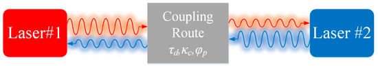 Different from commonly used Lang–Kobayashi equations [29,30,31], laser field E(t) is replaced by E(t) = S1/2exp(iφ) to facilitate the introduction of Langevin noise. The modified equations are given in Equation (1), where S, N and φ represent photon number, carrier number and optical phase, respectively. Both lasers are assumed to share the same parameters listed in Table 1, together with the definition of each symbol. Fn, Fs and Fp are Langevin forces driving the equations of carrier, photon and phase. Due to carrier-photon interaction in a semiconductor laser, Fn and Fs are correlated and cannot be described by white Gaussian noise directly. A noise generation technique as described in [32] is employed and the laser-parameter related noise sources are given by Equation (2).