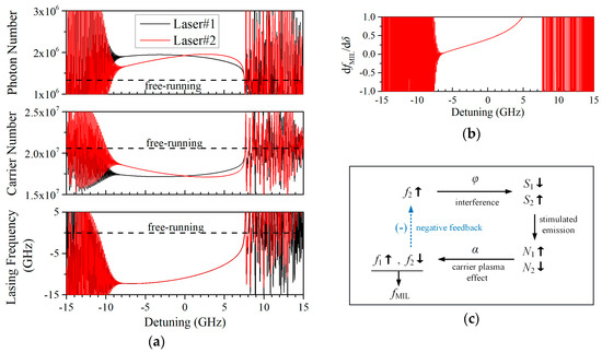 A negative feedback mechanism for frequency noise reduction exists in the mutually injection locked system, as depicted in Figure 2c. This results from the interplay between the photon and carrier, and their influence on the phase and frequency of the mutually coupled lasers. Supposing that the frequency of Laser#2 f2 is increased slightly due to frequency noise, the resulting variation in laser phase leads to a decrease in photon number S1 and an increase in S2 through the cosine terms in Equation (1), which corresponds to the interference between the injected and the generated optical fields. The variation of photon number then induces an increase in N1 and a decrease in N2 through the stimulated emission process. As a result of the carrier plasma effect, the laser refractive index varies as described by the linewidth enhancement factor term, resulting in a decrease in f2 and an increase in f1. Hence, a negative feedback is formed and the variation of mutually injection locking frequency fMIL is suppressed.