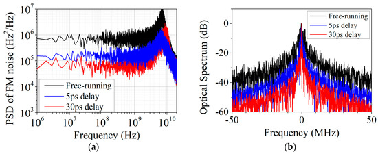 To provide a quantitative demonstration of the above analysis, Figure 3a depicts the improvement of power spectrum density (PSD) of frequency modulation (FM) noise and optical spectrum under mutual injection locking. Compared with the free-running state, injection locked lasers exhibit reduced frequency noise and narrowed linewidth. A special feature of the mutual coupling configuration is the coupling delay. According to Figure 3b, the linewidth is narrowed from 2.25 MHz in the free-running state to 460 and 206 kHz under injection locking state with 5 and 30 ps delay, respectively, indicating that longer τd helps enhance frequency noise suppression. For convenience of comparison, the simulated optical spectra in Figure 3b are shifted to the same central frequency and the same central power of 0 dB.