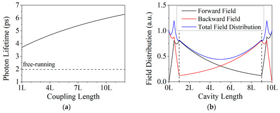 (a) Photon lifetime in mutual coupling system with different coupling lengths; (b) field distribution in the mutual coupling system. (Laser length L = 500 μm, coupling coefficient κL = 1.5, absorption coefficient αi = 10 cm−1, injection ratio: 13.5%, group velocity vg = 9.29 × 107 m/s.).