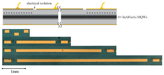 - Sun, C.; Xiong, B.; Wang, J.; Cai, P.; Xu, J.; Huang, J.; Yuan, H.; Zhou, Q.; Luo, Y. Fabrication and packaging of 40-Gb/s AlGaInAs multiple-quantum-well electroabsorption modulated lasers based on identical epitaxial layer scheme. J. Lightwave Technol. 2008, 26, 1464–1471. [Google Scholar] [CrossRef]