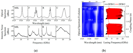 Laser behavior in a 3 mm long integrated device. (a) Optical spectra and intensity noise spectra of mutually injection locked state (MIL), four wave mixing (F), periodic oscillation with relaxation oscillation frequency (R) and chaos (C); (b) left part: evolution of measured optical spectrum with coupling current; right part: simulated lasing frequency of sub-DFB lasers with different coupling phases φp.