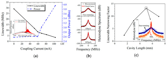 As was analyzed in Section 2, longer coupling region can lead to better noise suppression. This prediction is confirmed in Figure 8c. More pronounced linewidth suppression tends to be achieved in lasers with longer coupling regions except for the device with 7 mm cavity length. The reason for the decreased linewidth narrowing factor of the 7 mm device is attributed to heat effect: It requires the highest current to compensate the absorption in the coupling region and suffers from heat induced gain peak shift most severely. The largest linewidth narrowing factor of ~13 is achieved in the 5 mm-long device, and the delayed self-heterodyne signals are shown in the inset of Figure 8c. Laser linewidth is narrowed to 0.74 MHz with 6.1 mW output power, corresponding to a linewidth-power product of 4.5 MHz∙mW.