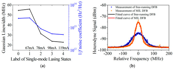 (a) Linewidth narrowing phenomenon measured by the local oscillator (LO)-heterodyne method; (b) linewidth narrowing phenomenon measured by delayed self-heterodyne method.