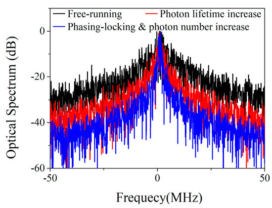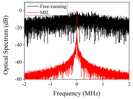 The delayed self-heterodyne spectra acquired by electrical spectrum analyzer are plotted in Figure 13b with 2 km (10 μs) fiber delay line. Compared with the free-running ones, the heterodyne spectra of injection locked lasers transform to the correlated type and exhibit ultra-high coherence features: (1) a delta-function-like RF carrier stands out at the central frequency; (2) notches spaced by 100 kHz emerge on the signal wings, corresponding to the reciprocal of the fiber delay time in the heterodyne measurement.