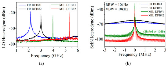 Linewidth narrowing of the mutually injection locked DFB lasers is confirmed by both local oscillator (LO) heterodyne and delayed self-heterodyne. For LO heterodyne in Figure 13a, the recorded beat signal is the convolution between the LO laser (TSL-210V, Santec, Komaki, Japan) and the laser being tested, and details in spectrum can be resolved due to better resolution than optical spectrum analyzer. The heterodyne spectra of free-running (FR) DFB lasers exhibit a Lorentzian shape with megahertz level linewidth. When mutual injection locking is achieved, the LO-heterodyne spectra of both lasers are narrowed significantly.