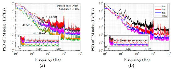 The PSD of FM noise of locked DFB lasers under different coupling strength and length are shown in Figure 14, obtained by delayed self-heterodyne measurement with 2 km fiber. The peaks at multiples of 100 kHz (reciprocal of delay time) are artefacts caused by converting the measured RF phase noise to laser frequency noise [17,40]. A strategy in [41] was employed to partially overcome these artefacts. The measured PSD of FM noise spectra suffer from 1/f n noise in low frequency range and white noise dominates above 100 kHz. Increasing the coupling strength leads to reduction of both types of frequency noises, and two lasers exhibit similar performance. Increasing the coupling length, i.e., the coupling delay, is also helpful for frequency noise reduction. The lowest white noise achieved in the system is about S0 = 20 Hz2/Hz, corresponding to an intrinsic linewidth of Δνint = πS0 = 62.8 Hz.