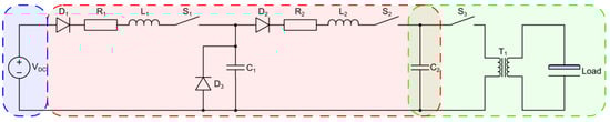 A new, simple topology of the pulsed power supply is depicted in Figure 1. It consists of three main conversion stages: (a) a DC voltage source; (b) a resonant charger circuit constituting the initial pulse energy by the voltage control of the capacitor C2; and (c) an output pulse shaper with Tesla coil-like transformer. In order to investigate the basic operation, role, and properties of each stage, they will be discussed separately, in detail, in the following subsections.