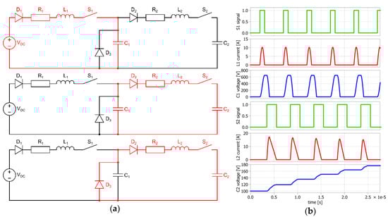 (a) The three intervals of capacitor charger operation and (b) simulated waveforms. PLECS® simulation platform was used for calculations. Interval 1 (top)—the energy of the input source is resonantly transferred to capacitor (with voltage boost effect) C1. Interval 2 (middle)—the energy of capacitor C1 is resonantly transferred to C2 and increases the voltage across C2. Interval 3 (bottom)—the resonant energy stored in the magnetic field of L2 is used to charge C2 using the freewheeling diode D3.