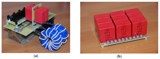 The proposed resonant charger consists of two series of monoresonant RLC (resistive – inductive – capacitive) circuits connected in a cascade. In the real power supply construction, inductors L1 and L2 were made of single MS-250026-2 micrometals cores with 15 turns each using litz wire windings of ~5.8 mm2 of copper wire to obtain an inductance of 22 uH. R1 and R2 are the parasitic resistances of inductors, wires, and printed circuit board tracks, in the real construction, the measured value was 17 mΩ. The core material used is called SENDUST, and it is designed for high-frequency power application inductors. The C1 capacitance has a measured value of 12 nF in the prototype and is made of WIMA FKP capacitors connected in series, due to the high dV/dt operation of that power supply stage. The C2 capacitance is a 1 uF capacitor bank made of nine 1 uF WIMA FKP capacitors connected in a mixed (parallel series) way, due to the high value of the capacitor current. Figure 3 shows the constructed resonant capacitor charger module and the C2 capacitor bank.