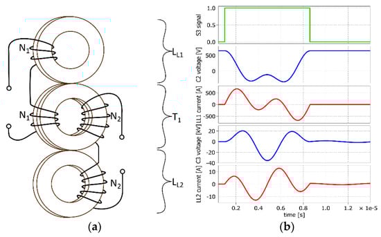 (a) A cored Tesla transformer construction concept with leakage inductances LL1, LL2, and the main magnetizing part T1; (b) the output pulse shaping unit simulation results, from the top: switch S3 control signal, C2 capacitor voltage, switch current, C3 capacitor voltage and current.