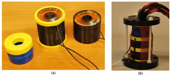 Most Tesla-based transformers are coreless (air coupling) but there are also constructions with magnetic cores [14]. Low permeability magnetic cores (e.g., distributed gap cores) were used in the presented design, instead of air coupling, which allows for significant reduction in the size of the transformer, although there is still a problem with the external magnetic field (electromagnetic interference, i.e., EMI) [15]. A low value in the transformer’s magnetic coupling factor results in large values of leakage inductance for the transformer windings. Magnetic field lines of these two leakage inductances are still closed through air, which results in distortions of the magnetic field in transformer surroundings. The external magnetic field of the transformer means that in addition to electromagnetic compatibility problem, there will also be additional power losses since external magnetic fields will interact with magnetic elements, e.g., transformer or converter enclosures, etc. [1,16]. In order to keep the magnetic field of the Tesla coil-like transformer inside its magnetic construction, a core-based Tesla transformer design is proposed, as shown in Figure 5.