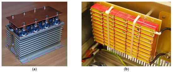 Due to high current amplitudes on the primary side of the transformer, eight parallel 1200 V, 100 A IXA70I1200NA IXYS IGBTs and eight 1200 V, 20 A CoolSiC™ IDH20G120C5 Infineon antiparallel diodes were used. Alike C2, the C3 capacitance is made of 50 WIMA FKP 10 nF capacitors connected in parallel, due to the high voltage amplitudes on the output of the power supply. The S3 switching module and the C3 output capacitor bank are presented in Figure 7.