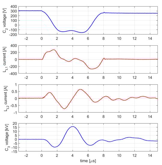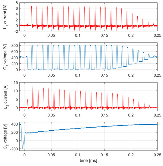 Figure 9 presents voltage and current waveforms for C and L elements of the resonant capacitor charger unit. The presented waveforms were recorded for 400 V of input voltage and under high load conditions. The charging process started at time zero, just after the previous output pulse generation process was finished. During normal operation, the initial voltage across capacitor C2 did not drop to zero because the unused energy from the output pulse generation process always recharge it. To charge the capacitor C2 from 0 V to its final voltage (400 V) 30 repetitions were needed, while in normal operation (under lighter loads), the typical number of repetitions was around 15–20.