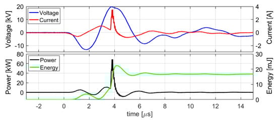Figure 12 shows the typical voltage and current waveforms of a PCD reactor discharge and calculated power and energy applied to the load. The corona discharges take place at the maximum value of the voltage (peak of ~20 kV); therefore, the current waveform has two components. First, coming from the capacity of the reactor and capacitance of C3 (shaped by resonance of the output circuit). Second, as the current peak connected with electrical discharges in the reactor [18].