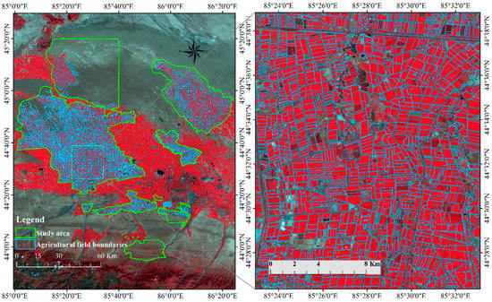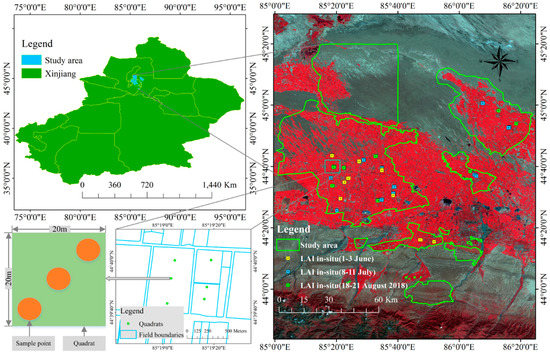 Location of study area and in-situ leaf area index (LAI) quadrats from three field campaigns. The background was the Sentinel-2A image acquired on August 20, 2018 and was shown in a false color band composition of R (8) G (4) B (3), with standard deviation stretch (right). The red color in the Sentinel image represents the vegetation (mainly crops and a few trees), the grey color represents the desert and bare land (right). The green dots represent the quadrats (including three sample points), and the blue polygons represent agricultural field boundaries (lower left).