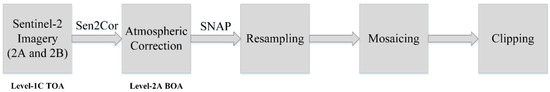 The acquired Sentinel-2 imagery products are Level-1C products, which are top of atmosphere (TOA) reflectances [40]. Atmospheric correction was conducted using the Sen2Cor (2.5.5, ESA, Frascati, Italy, 2018) and Sentinel Application Platform (SNAP) toolbox (6.0.1, ESA, Frascati, Italy, 2018) provided by the ESA to produce Level-2A bottom of atmosphere (BOA) products [41,42]. A flowchart of Sentinel-2 preprocessing is presented in Figure 3.