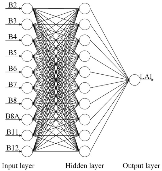 The ANN has been one of the most widely used ML algorithms for wide range of remote sensing applications. ANN is a computational model that is inspired by the human brain. ANN is formed by a collection of interconnected units (neurons) that learn from experience by modifying connections (weights) [56,57]. ANN usually consists of an input layer, hidden layer, and output layer. The backpropagation (BP) ANN used in this study implements a multilayer perceptron (MLP) algorithm that trains with a BP algorithm, while an MLP refers to a feedforward network that generalizes the standard perceptron by having a hidden layer that resides between the input and output layers. It has been demonstrated that MLP can approximate any continuous function to an arbitrary degree of accuracy, given a sufficiently large but finite number of hidden neurons [56,58]. In this study, the input layer and output layer are referred to as the Sentinel-2 spectral bands (reflectances) and the cotton LAI, respectively.
