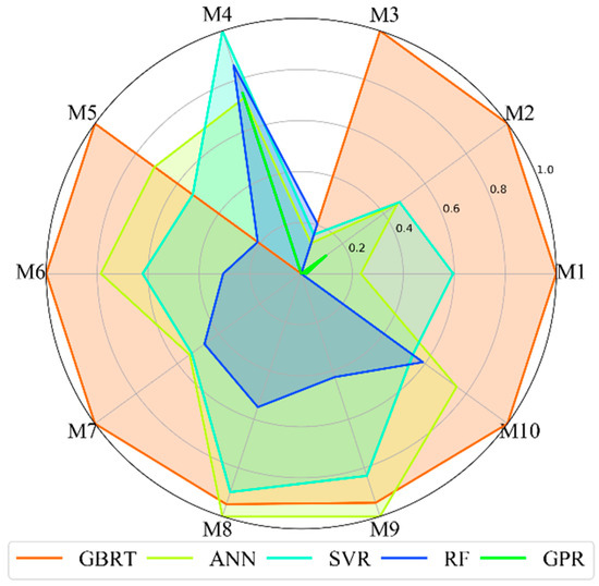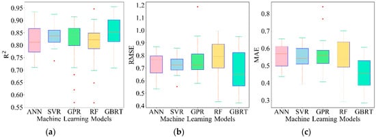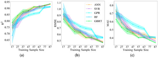Figure 7 shows the changes in , RMSE and MAE as the training sample sizes varied, the standard error is given at each training sample size (filling area of each model), lower values of the filling area corresponds to smaller standard error, and consequently, more robust model performance. According to Figure 7, different sensitivity performances of the sample size variation are found among the ML models. GPR and GBRT show robust performances for the training samples according to the standard error of different models. GBRT produces a remarkable performance for the training samples that is more robust than the other models, GPR behaves suboptimally. ANN and SVR are very sensitive to the training samples. Moreover, all models behave more robust with the growth of training sample size according to the variation of standard error. In summary, the model accuracy improves overall with an increasing training sample size, while GBRT provides the most robust performance for the training samples, and the best model accuracy among the variations in training sample size on average ( = 0.884, = 0.615 and = 0.452, calculated by all the 8 groups of training sample size).