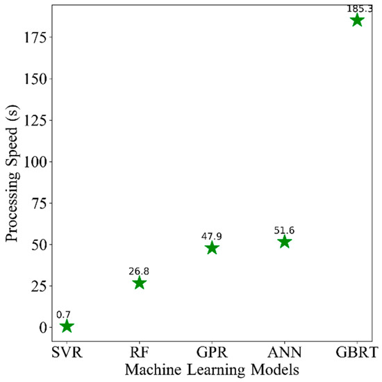 Beyond the model accuracy of the five models for the training and testing random split, it is of particular relevance to compare the computational efficiency (time required to the model during training and validation processes) of the models, as it is an important criterion for operational algorithms. All models were implemented in a Python environment on an Intel(R) Xeon(R) CPU E5-2620 v2 @ 2.10 GHz processor and installed memory (RAM) of 32.0 GB. The computational efficiency is recorded from the 20 repetitions in Section 4.1. The averaged results of 20 repetitions are illustrated in Figure 6. Large differences among the five ML models are clearly found. SVR performs incredibly fast (less than 1 s). However, GBRT is frustrating, owing to the large amounts of its hyperparameter tuning processes. In general, SVR is able to deliver near real time operational products with a highly efficient processing speed, whereas the GBRT model is not recommended for this kind of application, because the GBRT model is computationally more demanding. RF, GPR and ANN showed moderate performances in terms of computational efficiency.