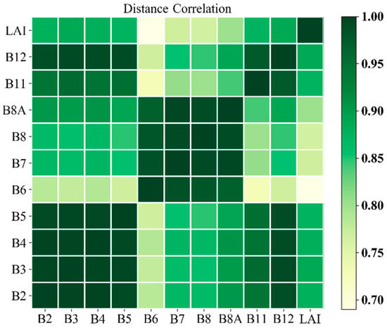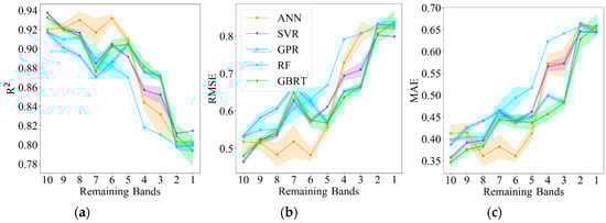 In terms of spectral band sensitivity analysis, the distance correlation results showed that the SWIR and visible bands have great potential to improve the accuracy of cotton LAI retrievals. By using dCor combined with the backward elimination method, the model accuracy decreases with the reduction in spectral bands. SVR, GPR and RF perform robustly with the spectral bands, and ANN provides the best accuracy on average. The minimum number of bands required for cotton LAI retrieval are recognized as 6 (ANN), 6 (SVR), 5 (RF), 5 (GBRT) and 8 for GPR.