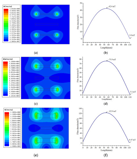 Figure 5a,c,e shows the magnetic fields distribution in two-dimension when the width of each pair of the permanent magnet was 5, 10, and 20 cm, respectively. Figure 5a,c,e shows the top view of Figure 4. At the middle of the figure were superconducting tapes. The magnetic fields at the superconducting tapes were very small. Figure 5b,d,f shows the flux density at the middle of the testing superconducting tapes when the width of each pair of the permanent magnet was 5, 10, and 20 cm, respectively. The flux density was always higher at the middle than at the edge of the testing tapes. Figure 5b,d,f shows that the maximum flux density at the middle of the superconducting tapes was 42.4, 75.9, and 122.9 mT when the width of each pair of the permanent magnet was 5, 10, and 20 cm, respectively. The flux density at the edge of the superconducting tapes was 1.8, 3.1, and 6.47 mT when the width of each pair of the permanent magnet was 5, 10, and 20 cm, respectively.