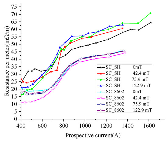 The rate of increase was different between the two tapes, as shown in Table 2. For the SC_SH superconducting tapes, when the prospective current changed from 400 A to 900 A, the quenched resistance increased faster than when the prospective current was more than 900 A. For SC_8602 superconducting tapes, the quenched resistance increased faster when the prospective current changed from 620 A to 900 A than when the prospective current was more than 900 A. The rising rate of SC_8602 was low when the prospective current changed from 400 to 620 A.