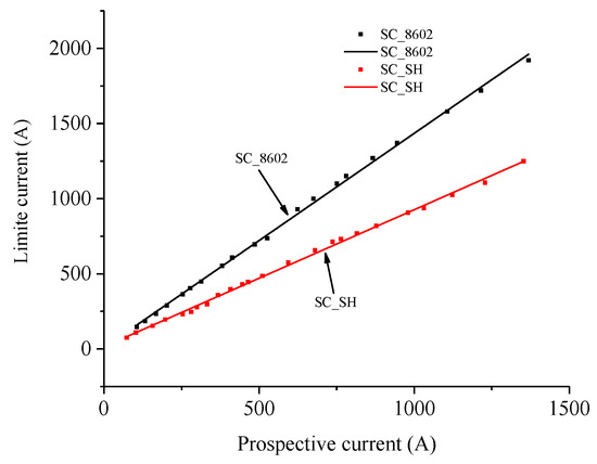 Figure 9 shows the relationship between the peak value of the prospective current and the peak value of the limited current of the two tapes under the magnetic field of 122.9 mT. The dots in Figure 9 are taken from experimental results, and the lines are linearly fit lines of the dots. The limited current increased almost linearly between SC_SH and SC_8602 when the prospective current increased. The limited current of SC_8602 was higher than SC_SH due to its smaller quenched resistance. The relationship between the prospective current and the limited current was similar in other testing magnetic fields such as 42.4 and 75.9 mT.