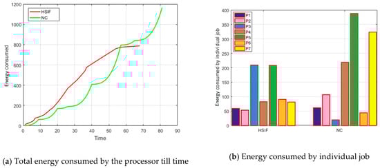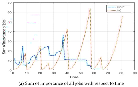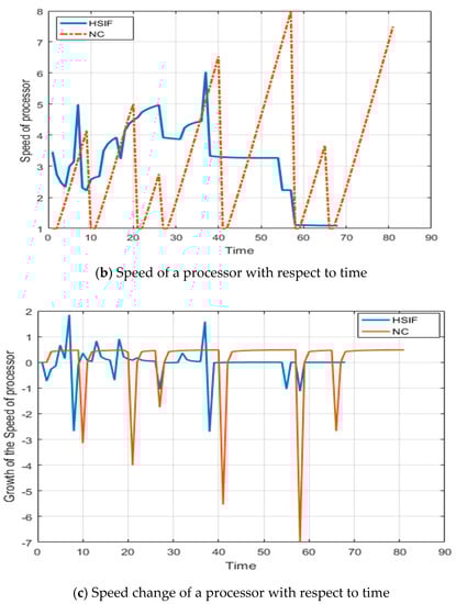 After observing the graphs of Figure 1a,b, it is clear that the HSIF adjusts the sum of the importance of active jobs frequently (count of maxima), but the change in the values is small (difference in the consecutive maxima). This shows that HSIF is maintaining the consistency in the performance. The speed of a processor depends on the sum of importance; therefore, the speed of a processor is having the same reflection. This frequent but less change in the speed makes the HSIF consistent in performance. In NC, the frequency of change in the sum of the importance of active jobs is lesser, but the difference in the change is very high. The speed of a processor using NC depends on the sum of executed size of active jobs; therefore, the speed of a processor variates highly. This high variation makes the NC less consistent in performance.