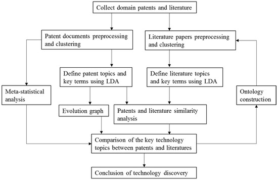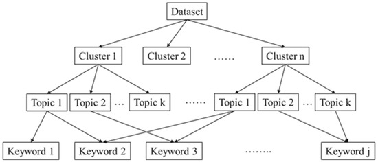 Latent Dirichlet Allocation (LDA) is a statistical model used to explain the similarity of data. The concept of LDA originated from a population genetics study in 2000 as first proposed by Blei et al. [54]. LDA assumes that each document is a mixture of a few topics and that each word fits within some topic of the document. LDA is a topic model, where each document has a topic probability distribution, and each topic has a word probability distribution. LDA can better eliminate word ambiguity and assign documents more accurately to topics [55]. Zou [56] developed a smart method for building an ontology using LDA topic modeling and identifying the key phrases under each topic from a large number of patent documents. The patent documents are clustered using the k-means and hierarchical clustering methods and then the LDA topic model is built based on each cluster. The number of topics is determined by researchers by observing the model training results. After the topic models are established, the key phrases under each topic become the output and the ontology of the domain patents is constructed. The ontology architecture is shown in Figure 8 [56]. The topics are held constant and the time information within the model is treated as a variable and used to discover these hidden topics [57]. Changes in words along with changes in time are used to detect topic patterns. Doucet et al. provide an approach which allows a model to change over time using sequential importance sampling or particle filtering. Canini et al. describe an implementation of online LDA framework with particle filters that yields better results than multiple LDA runs.