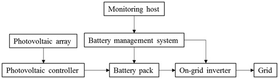 The on-grid system consists of a PV array, a PV controller, battery packs, a battery management system, an inverter, an energy storage unit and a dispatch control system [27]. Solar panels convert light energy into electricity which charges the lithium battery pack. DC power is converted to AC power through the inverter. The controller continuously switches and adjusts the working state of the battery pack according to changes in sunshine intensity and the load status. The electricity is sent to the DC or AC converter for immediate use or the excess DC power is sent to the battery pack for storage. When power generation cannot meet the load demand, the controller uses power from batteries to ensure the continuity and stability of the system. The on-grid inverter system consists of several inverters, which convert the DC power from the battery into a standard voltage for the user-side low-voltage grid or for transmission to the high-voltage grids. The advantages are a safe and simple design, easy maintenance, with efficient solar energy generation that is higher than stand-alone systems. Figure 3 shows the operation concept of the on-grid storage system [26].