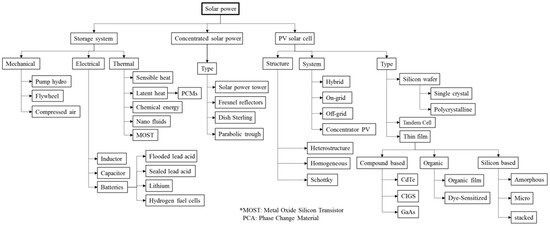 By reviewing literature, the ontology of solar power is constructed. Solar power generation technology is divided into three parts, PV technology that uses the photoelectric effect to directly transform sunlight to electricity, concentrated solar power that heats water into steam to power machines such as power turbines, and storage systems (e.g., batteries) for uninterrupted supply of electricity when sunlight is not available. Figure 5 illustrates the concepts and newly derived technology structure identified by the comprehensive reviews. The ontology schema, as a structured knowledge map, is iteratively constructed mainly from literature reviews (and can be updated by the state-of-the-art patent reviews), as detailed descriptions of key solar technologies and their relationships.