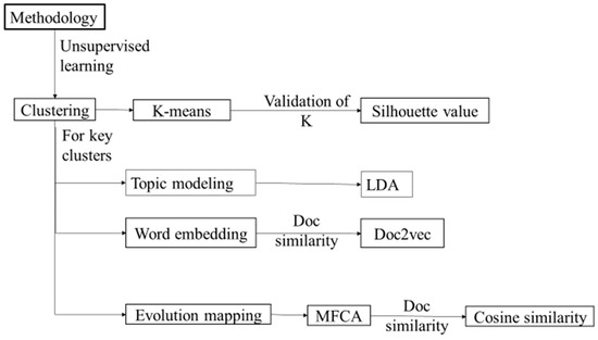 Clustering is an application of unsupervised machine learning and divides documents into groups based on their correlations [41]. A good cluster result has greater similarity within the same group but smaller similarity between different clusters. By exploring keyword terms that appeared in domain patents, patents with similar keyword terms are clustered into the groups. Trappey et al. [42] used Normalized TF-IDF to find the key terms in the corpus of 3D printing patents, considering different lengths of patent documents, for hierarchical clustering, K-means, and K-medoids to better analyze patent sub-technology clusters. Kim and Bae [43] also proposed an approach to forecast promising technologies by clustering patents. A symmetrical patent-patent matrix is constructed by calculating the Pearson’s correlation coefficient between patent documents. Then, the k-means algorithm is used to cluster patents with the average silhouette width applied to determine the best number of clusters. The topic for clusters is defined by examining the combination of patent classification categories from each cluster. Finally, patent indicators such as forward citations, triadic patent families and independent claims are analyzed to summarize the promising technologies.