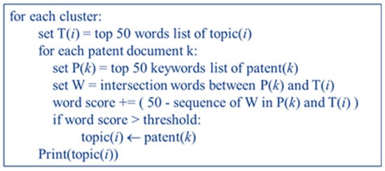 In this research, topic models are built under each cluster in order to better describe a cluster using the word distribution list. After the topic models are generated under each cluster, patent documents are assigned to each topic model by matching the keywords of patents and topic and calculating the similarity scores. The original concept of the assignment measure is to check the number of words appearing in the top patent keywords and topic model which indicates the two documents are more similar. The sequence of keywords is considered using the modified assignment measure weighting algorithm shown in Figure 9. First for each cluster, T(i) is set to be the top 50-word list of topics(i); then for each patent document k, P(k) is set to be the top 50 keyword list of patent(k) and W is the intersection words between P(k) and T(i). The similarity score of patent(k) and topic model (i) is the accumulated score of the 50-sequence of W in P(k) and T(i)), where an intersection word is assigned a higher score if it located higher in the keyword list. If the word score is higher than the threshold number, the patent (k) is assigned to topic(i).