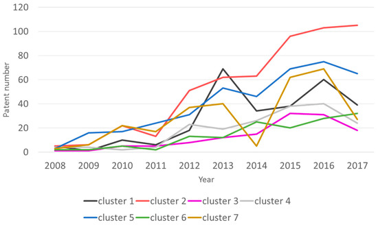 The collected patents are distributed into seven clusters and the publishing trend for each cluster is shown in Figure 10. Most clusters have an increasing trend with some dropping in the same period, which follows a similar trend for total published patents (Figure 10). Clusters 2 and 5 are assigned the most patents, with a continuous increase of patent numbers representing the largest global technical field in solar power. In addition, these two clusters are growing with stability compared to other groups.