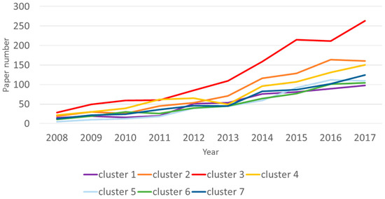 Clustering is also applied to academic literature. A total of 5610 documents are distributed into seven clusters. The academic publishing trend for each cluster is shown in the Figure 11. The seven clusters have similar increasing trends with Clusters 3 and 2 showing similar increases in research activity.