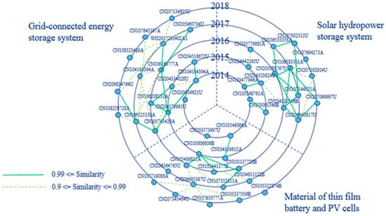 When comparing the seven patents (in Figure 13) to the related literature clusters and topics (in Table 4), we found that the patents are relevant to literature Clusters 2 and 5, which consist of articles in the (modular) simulation systems of on-grid and off-grid (stand-alone) networks and DC electricity supplies. More specifically, the papers under Topic 4 in Cluster 2 are most similar to the target patents, covering the technical issues of “grid-connected solar energy storage systems or their intelligent management systems.” Among these papers, earlier papers focus more towards the off-grid related technologies. For instance, a study in 2009 proposed a fuzzy logic control module of stand-alone PV system with battery storage [68]. Another study [69] in 2012 proposed a control method of the stand-alone direct-coupling PV-water electrolyzer. However, papers published recently focus more on grid-connected network systems and the real time algorithms. For example, in 2014, Sridhar and Meera [70] developed a grid-connected solar PV system using a real time digital simulator. Furthermore, Li et al. [71] in 2018 investigated the performance of a grid-connected residential PV-battery system focusing on enhancing self-consumption and peak shaving in Japan. Petrollese et al. in 2018 [72] also studied coordinated control for grid integration of a PV array, battery storage and super-capacitor. The patent clustering and evolution trends, as depicted in the case study, match well with the results of literature clustering and topic mining when cross referencing comparisons are conducted. The results strengthen the reliability of the technology mining and reviews for the solar power energy industry.