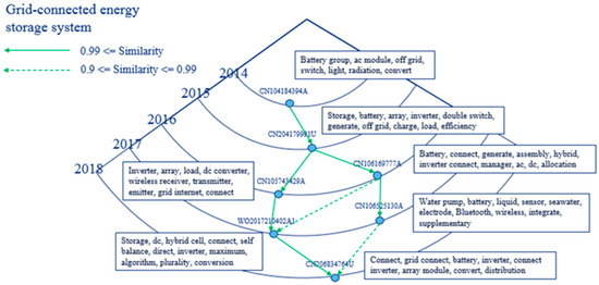 The clusters and evolution pathways for solar energy patents using the concept lattice algorithm are shown in Figure 12. A total of 52 patents from three categories (grid-connected energy storage systems, solar hydropower storage systems and thin film battery and PV cells) between 2014 and 2018 are displayed in the five concentric circle. Each data point represents a patent document, and is connected to the others in terms of the cosine similarity value. The green solid lines identify the connection where the similarity value is larger than 0.99. The green dotted lines identify the connection where the similarity value is between 0.9 and 0.99. From these patents, this research focuses on the category of grid-connected energy storage systems, which is most relevant to the Internet of Things technology. Figure 13 displays the stem path in this category with the key terms of each plotted patent. Patent CN104184394A describes household off-grid photovoltaic power generation systems (key terms: battery group, AC module, off-grid, switch, light, radiation, convert). Patent CN204179991U describes solar photovoltaic power generation devices (key terms: storage, battery, array, inverter, double switch, generate, off-grid, charge, load, efficiency). Patent CN105743429A describes off-grid photovoltaic power generation systems based on Internet of Things (key terms: inverter, array, load, DC converter, wireless receiver, transmitter, emitter, grid internet, connect). Patent CN106169777A describes a micro-grid system with DC and AC hybrid power supply (key terms: battery, connect, generate, assembly, hybrid, inverter connect, manager, AC, DC, allocation). Patent WO2017210402A1 describes self-balancing photovoltaic energy storage systems and methods (key terms: storage, DC, hybrid cell, connect, self-balance, direct, inverter, maximum, algorithm, plurality, conversion). Patent CN106525130A describes a Bluetooth technology using a wireless sensor device (key terms: water pump, battery, liquid, sensor, seawater, electrode, Bluetooth, wireless, integrate, supplementary). Patent CN206834764U describes photovoltaic power generation systems (key terms: connect, grid connect, battery, inverter, connect inverter, array module, convert, distribution). The assignee of patent CN106525130A, Tianjin University, is the top three assignee which implies the high value of this patent as well as the evolution analysis.